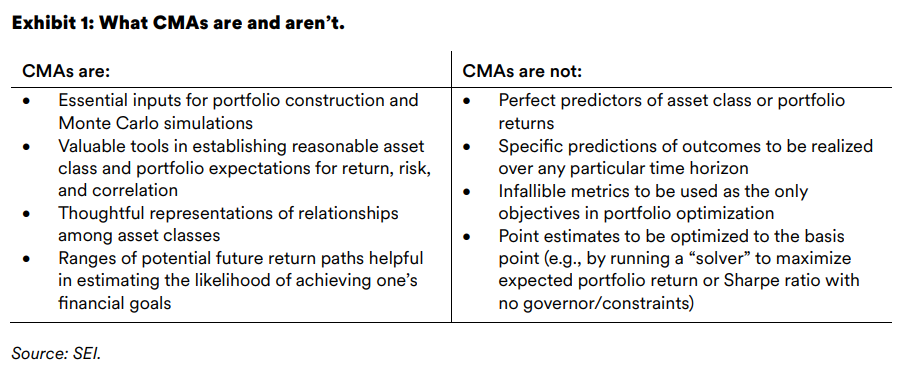 “It is difficult to make predictions, especially about the future.” While this quote has been variously attributed to figures as disparate as Niels Bohr and Yogi Berra over the years, the sentiment rings true regardless of its source; prognostication is a tough business. SEI is extremely proud of our process for developing CMAs, and we believe our estimates to be unusually good, but any forecast is subject to estimation error. We employ a variety of techniques to minimize this error, but no one can eliminate it entirely. Regardless of where investors source their CMAs, these assumptions should be viewed as just one component of a robust portfolio construction process, tempered with sound judgement and an acknowledgement of uncertainty.