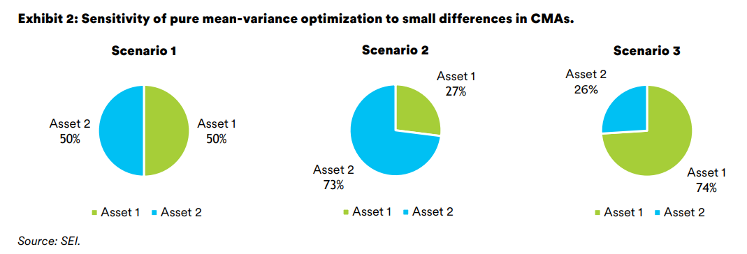 Pure mean-variance optimization—assuming one’s CMAs are perfect and maximizing expected risk-adjusted returns based on those exact estimates—is notoriously fragile. Small changes to CMAs, particularly expected returns, can lead to extreme shifts in ostensibly optimized portfolio weights. Given the inherent imprecision of any forward-looking estimate, this vulnerability poses a significant challenge to constructing optimized portfolios based on CMAs alone; unconstrained meanvariance optimization requires a degree of precision that is unrealistic for any forward-looking assumption.